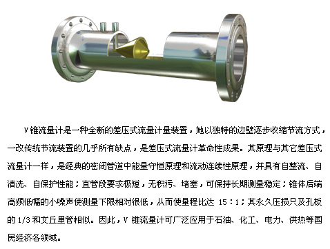 V錐流量計是一種全新的差壓式流量計量裝置,并以獨特的邊壁逐步收縮節流方式,一改傳統節流的幾乎所以缺點,是差壓式流量計成果,因此V錐流量計可廣泛用于石油,化工,電力,熱供等國民經濟各領域